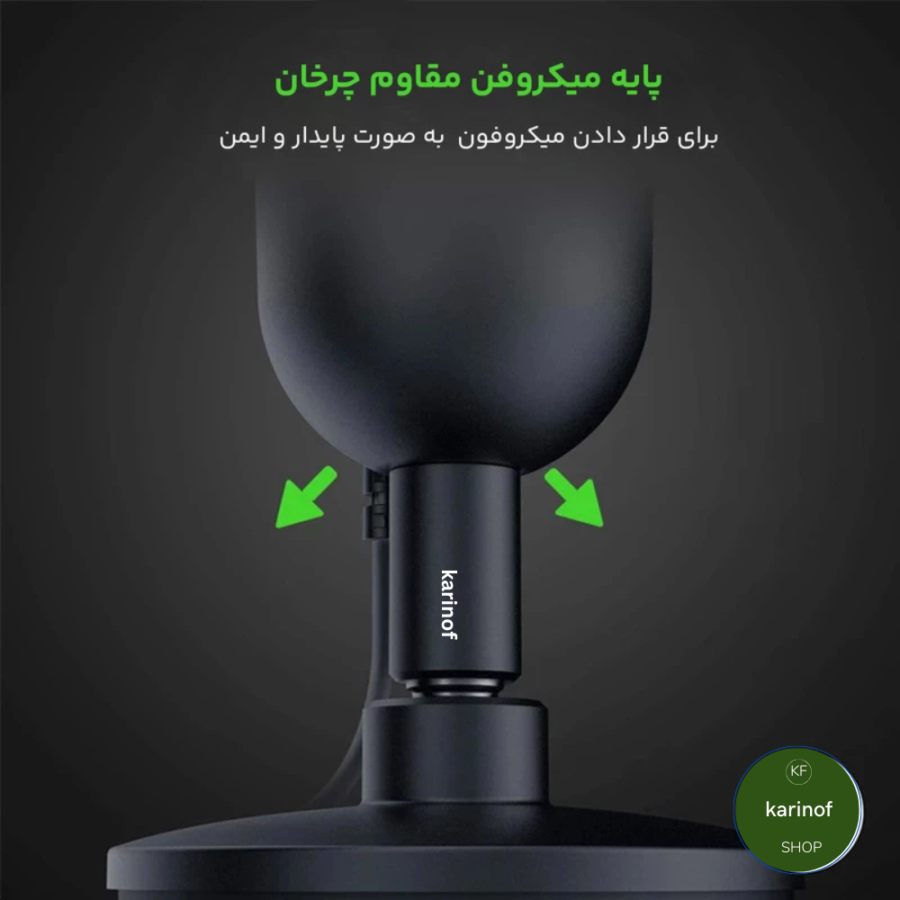 طراحی پایه این میکروفون نیز جالب توجه است. پایه محکم آن قابلیت چرخش و تنظیم زاویه دارد که امکان تغییر موقعیت میکروفون برای بهبود کیفیت ضبط صدا را فراهم می‌کند. همچنین، اگر نیاز به انعطاف بیشتری دارید، این میکروفون با پایه‌های میکروفون حرفه‌ای نیز سازگار است.